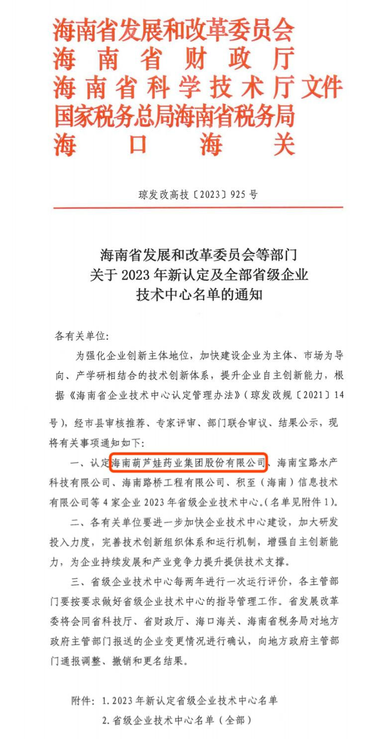 近日,海南省发改委等多部门联合公布了《关于2023年新认定及全部省级企业技术中心名单的通知》,其中,海南币游国际药业集团股份有限公司成功通过评审,被认定为省级企业技术中心,是本次获批的4家企业之一。